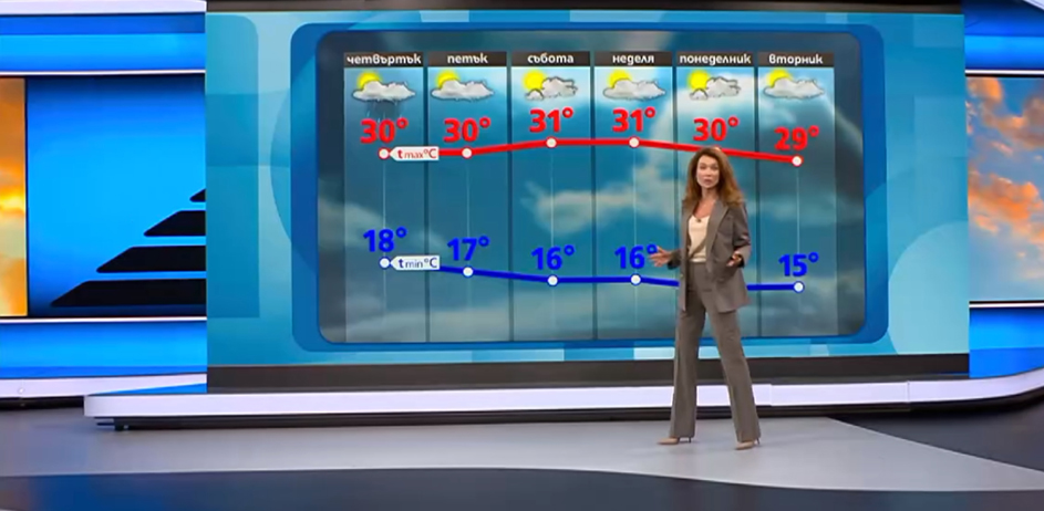 През почивните дни, както и при започване на новата седмица, ще е без превалявания и с повече слънце. Вятърът ще е от североизток и температурите ще останат без основна смяна. През деня ще доближават стойности към 30 градуса, изясни още Никол Станкулова.