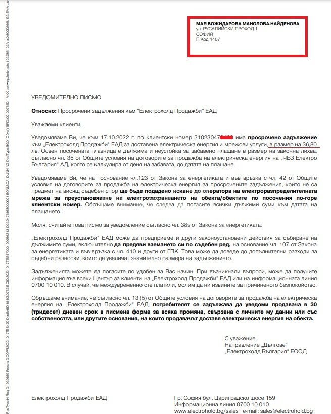 Уведомяваме Ви, че на съображение чл.123 от Закона за енергетиката и по отношение на член 42 от Общите условия на договорите за продажба на електрическа сила за просрочените отговорности, които не са предмет на провесен правосъден спор ще бъде подадено искане до оператора на електроразпределителната мрежа за прекратяване на електрозахранването на обекта/обектите по посочения нагоре потребителски номер.