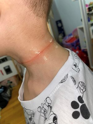 " Детето ми претърпя нещо извънредно в по този начин наречения им " детски ъгъл ". Тези злокобни рани по врата са от разпокъсаната им катерушка на която увисна! Слава богу детето ми е добре ", написа обезпокоената майка.