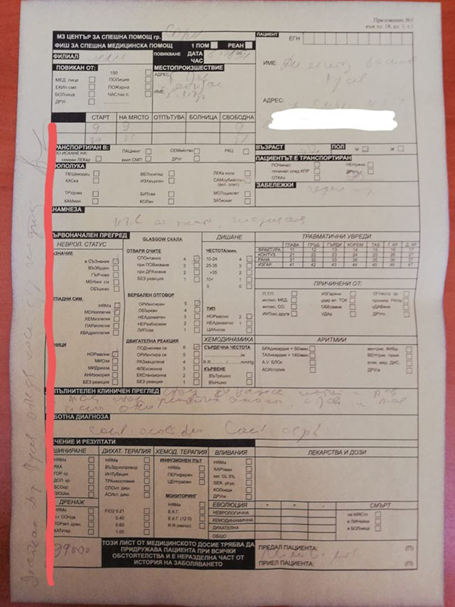 Майката на пребития в столичния кв. " Белите брези " Димитър Русев е отказала сама синът й да бъде приет в болница, а не е бил изоставен от колата за спешна помощ. Това твърдеше в обявата си във фейсбук братовчедът на нападният мъж - Васил Русев. Той описа в обществената мрежа, че роднината му е бил пребит от двама непознати с бокс и противошокова палка. Описа, че и лекарите, и служителите на реда, го оставили в локва кръв. Документи, с които " 24 часа " разполага, обаче демонстрират, че майката на Димитър, която е очен доктор, сама е отказала синът й да бъде откаран в болница. " Майката доктор Русева отхвърля хоспитализация ", написа настрана на документа, на който дамата се е подписала. Затова медици и служители на реда недоумяват за какво братовчедът на Димитър е написал подобен статус с обвинявания към двете институции, откакто личната майка на бития оперен артист е отказала помощ. Те показват и разминаване в часа на сигнала. Заради багра Димитър губи второто си око. Зрението на другото си око изгубил при различен пердах преди 3 години. Нападателите се търсят.