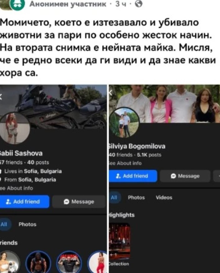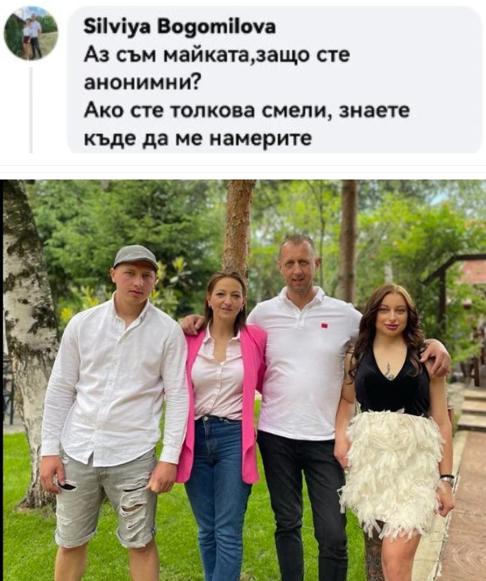 Стана ясно, че дамата, която взе участие в този садизъм е Габриела Сашова от село Дивотино, щерка на Силвия Богомилова. Бившата претендент кметица от Демократична България пък изобщо не се тормози от осъщественото от щерка й, а реши да заплашва във Facebook хората, възмутени от извращенията на щерка й Габриела.