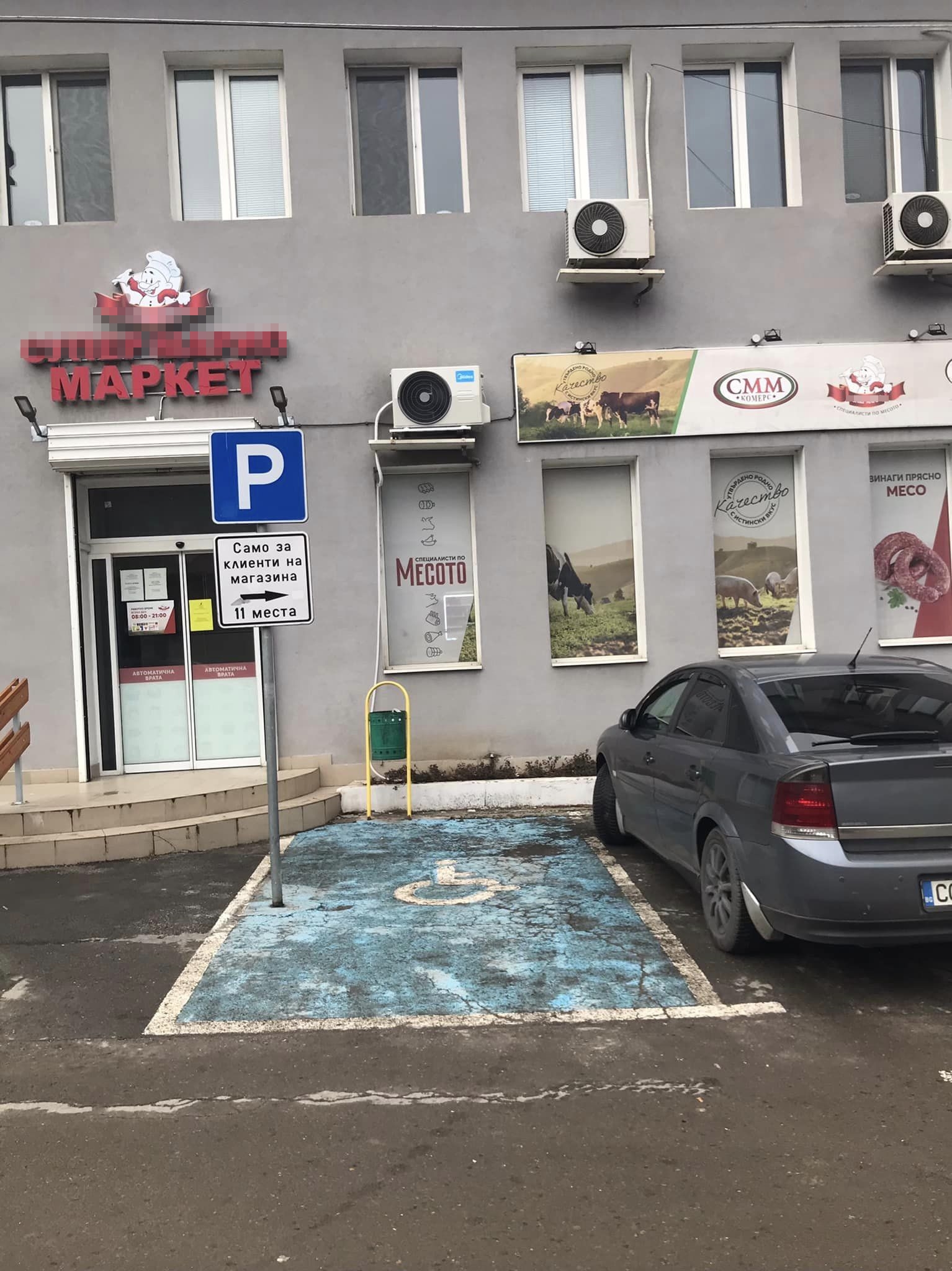 Знак, обозначаващ инвалидно място, е подложен несъответстващо на паркинг на магазин за хранителни артикули в град Своге. Седефка Кузова сигнализира в обществената мрежа Facebook за безумието.