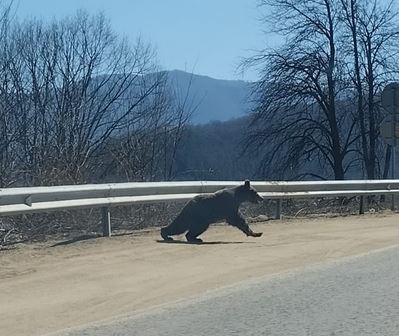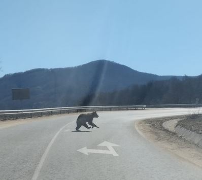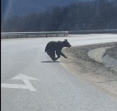 Мече притича измежду бял ден през планински път в Стара планина. За любопитната среща споделя лидер в обществената мрежа Фейсбук.