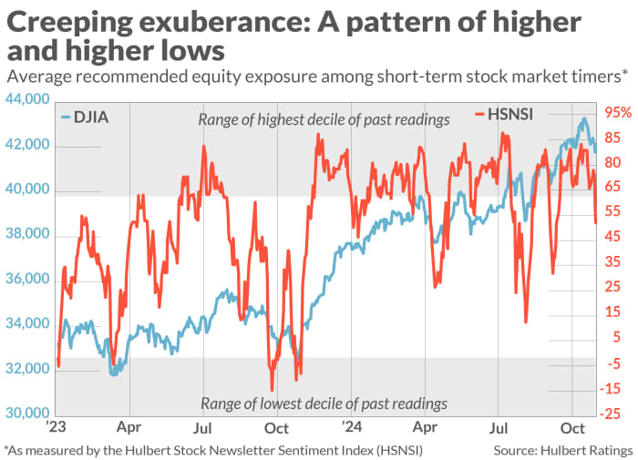 Мечият пазар, когато идва, ще бъде изключително мъчителен. Това е по този начин, тъй като от ден на ден вложители, които се пробват да таймират пазара, чакат отдръпване, което да употребяват за покупка на активи. Това е издайнически знак за възходящо „ обилие “ на пазара, което е мечи от противоположна позиция.Причината, заради която пазарните таймери са станали толкоз доста, е, че всяко от отдръпванията на пазара през последната година се оказа плитко, което ги накара да заключат, че отдръпванията би трябвало да се третират като благоприятни условия за покупка.В резултат на това „ Стената на паниките “, по която бичите пазари обичат да се изкачват, става все по-слаба. Това от своя страна допуска, че възобновяване на тази стена - т.е. убеждаването на пазарните таймери, че всеки спад не е безусловно опция за покупка - ще изисква бездънен и мъчителен спад на пазара, съгласно Марк Хулберт, колумнист във финансовото издание MarketWatch.com.Това възходящо обилие е илюстрирано в съпътстващата диаграма, която нанася междинното целесъобразно равнище на експозиция на акции измежду подмножество от няколко дузини краткосрочни таймери на фондовия пазар.