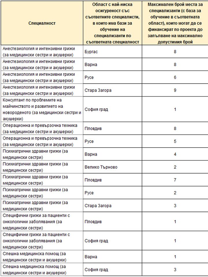 2. медицински сестри и акушерки – специализанти по изброените по-долу специалности в посочените области, както следва: