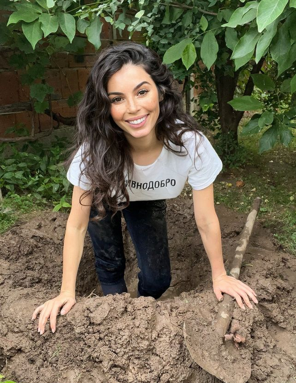 Мегз продължава да се заравя в земята. Дизайнерката се завърна в България, само че не стопира с практиката да се покрива цялата с пръст.
