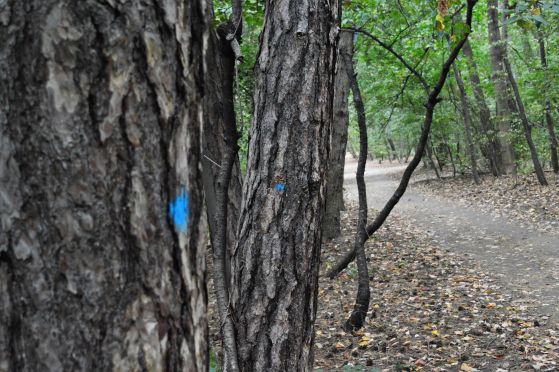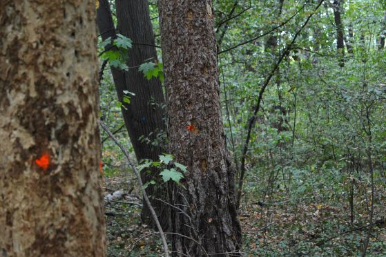 Със синя точка пък са маркирани дърветата, които ще бъдат окастрени. Ниско на дънера на дървото е сложена марка на специалист, която подсигурява, че няма да бъде отсечено дърво, маркирано с пъстър спрей на гръдна височина от някой недоброжелател.