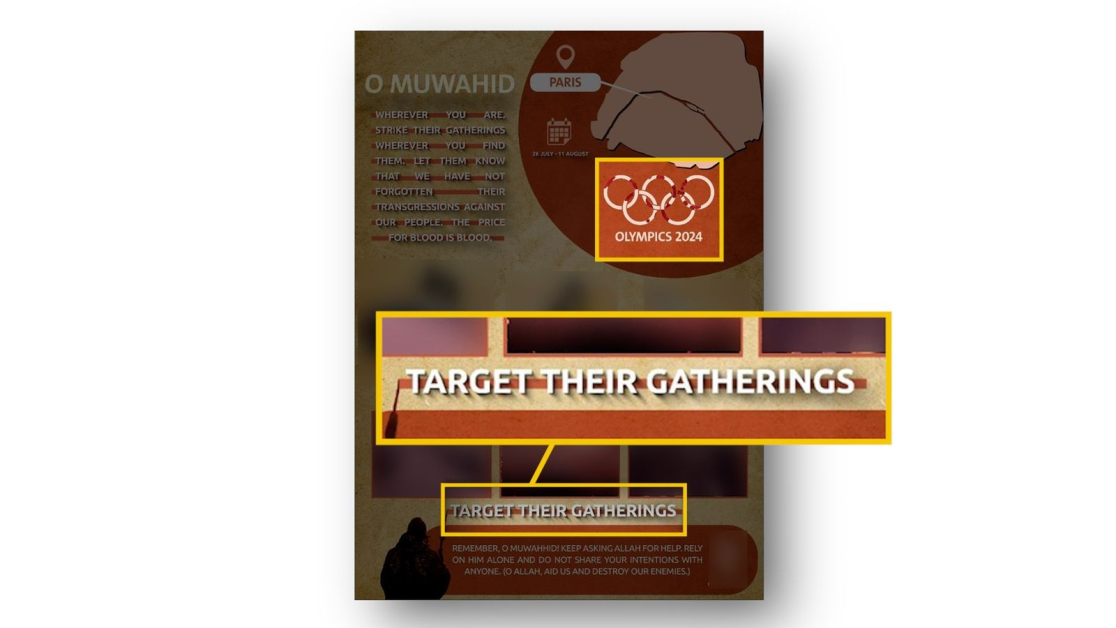 Плакат на IS-K, подбуждащ към принуждение на Олимпийските игри в Париж, " Целете се в техните събирания. "