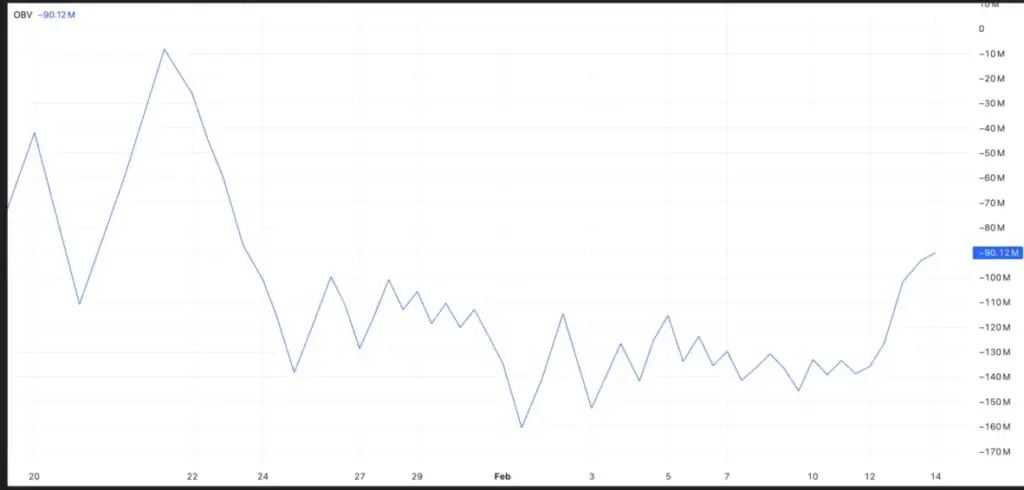 Един от признаците за това възходящо търсене е възходящият размер (OBV) на 12-часовата графика, който отразява мощна покупателна интензивност. OBV наблюдава потока на размера, като го прибавя в дните, когато цените се покачват, и го изважда, когато те спадат. Продължаващата възходяща наклонност на този знак допуска стабилно търсене от страна на трейдърите.