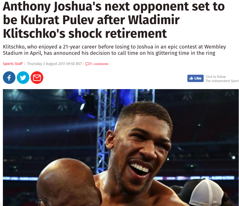 “Следващият противник на Антъни Джошуа ще бъде Кубрат Пулев, откакто Владимир Кличко се отхвърли шокиращо от спорта”, написа Independent.