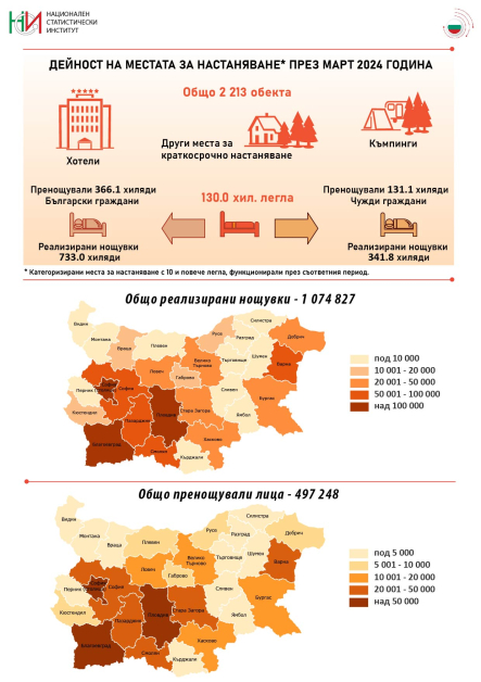 Броят на пренощувалите лица се усилва близо 10% в съпоставяне със същия месец на 2023 година и доближава 497 200, като е регистрирано нарастване както при българските жители - с 11.9%, по този начин и при непознатите - с 4.1%.