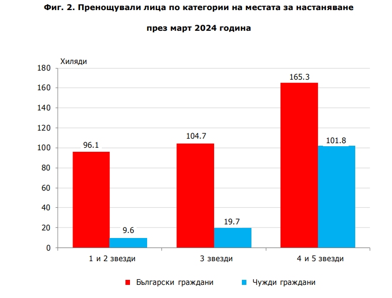 През този месец българите също си разрешавали по-луксозни места за настаняване, регистрират от Национален статистически институт. 45 на 100 от нашенци са избрали точно хотели с 4 или 5 звезди. В 3-звездните са осъществени 15.6% от нощувките на непознати и 28.2% - на български жители.