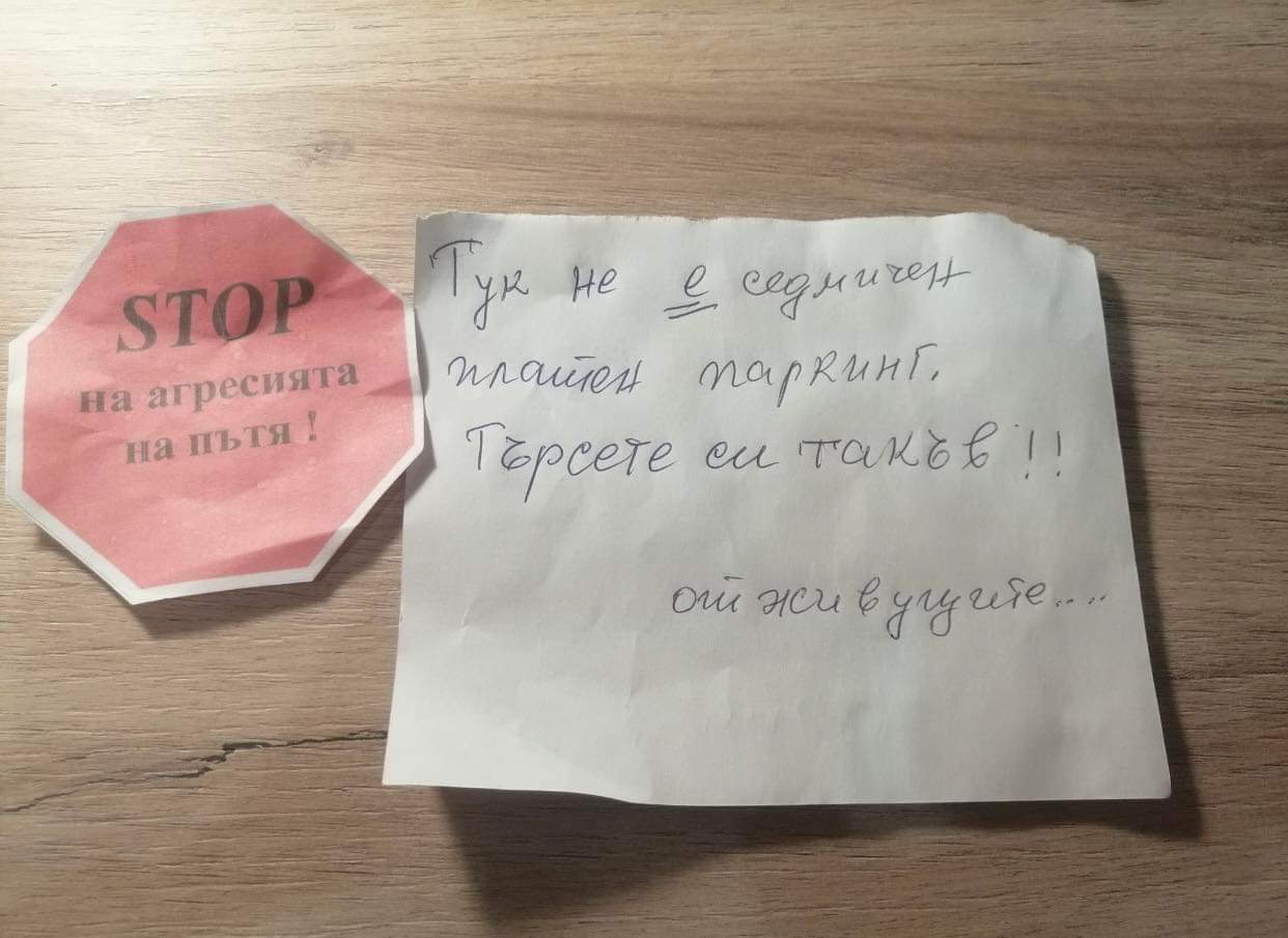 Случката се развива на ул. „ Равнища ” пред парка за кучета в Смирненски, на която юноша оставя колата си паркирана за три дни. Връщайки се към автомобила си след тези три дни, той вижда записка с надпис „ Тук не е седмичен заплатен паркинг. Търсете си подобен!! …. От живущите ” и стикер „ STOP на експанзията на пътя ”.