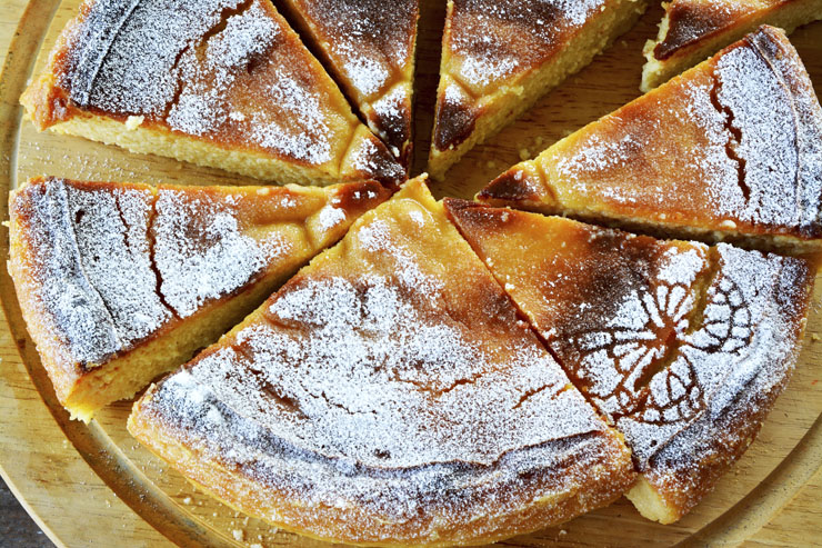 Migliaccio Napoletano е десерт с забавна история, който е извървял дълъг път, претърпял е обилни промени и през днешния ден е прочут като нежна и извънредно ароматна версия на своя предшественик.Според античните предписания в началото се е приготвял от просо (miglio) и свинска кръв,която е считана за мощна и питателна храна, отлична за селския живот. Католическата традиция е причина тази съставна част да бъде отстранена, тъй като е смeтната за прекомерно езическа, а буржоазните нрави постановат потреблението на грис от твърда пшеница вместо просо.Днес сладкишът се подготвя от грис, мляко, яйца, рикота, ванилия, кори от лимони и портокали - съставки, които го трансформират в внимателно прелъщение и същинска приятност когато и да е. Използвах 180 г грис (semola),500 г мляко, 300 г вода, 250 г захар, 250 г рикота, 3 яйца, 50 г масло, 2 портокала, 2 лимона, ванилия, пудра захар. Как го направих: В необятен съд смесих мляко, вода, 50 г от захарта, масло, малко ванилия и обелените кори от 1 лимон и 1 портокал. Загрях на сдържан огън като разбърквах с дървена лъжица, до момента в който захарта и маслото се разтопят. Добавих грис, понижих топлината и разбърках за няколко секунди, до момента в който сместа стана гъста. Отстраних корите, покрих с фолио и оставих да изстине (добре е да студена, с цел да не мирише на яйца).Разбих яйцата с останалата захар, прибавих ванилия, настъргана кора от портокал и лимон. Когато сместа стана обемна прибавих рикота и размесих добре. Смесих яйчената примес с гриса и разбърках, до момента в който се получи безпрепятствено тесто. Изсипах в 22 см кръгла тава, намазана с масло и посипана с брашно. Изпекох на 180 С за към 50 минути. Оставих да се охлади за 1 час, освободих от формата, поръсих с пудра захар и сервирах.
