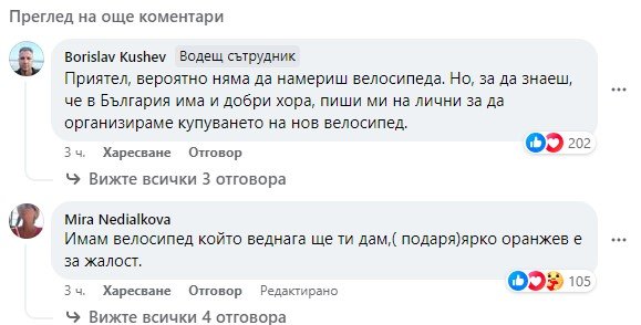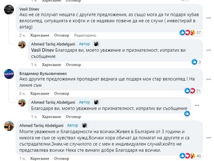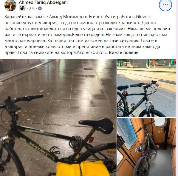 Мигрант от Египет, пристигнал в България преди 3 години, се оплака в обществените мрежи, че са му откраднали колелото. Ахмед Мохамед показа в групата " Забелязано в София ", че е работил като снабдител на храна и велосипедът, с който е доставял поръчките, бил откраднат до момента в който се разплащал с клиенти. Вместо да му се присмиват обаче, десетки хора предложиха да му подарят колело, с което да продължи да си изкарва хляба по почтен метод.