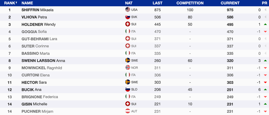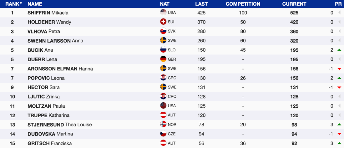 В битката за дребния бистър глобус с четири победи в шест старта Шифрин е отпред с 525 пункта и задатък от 105 по отношение на Холденер. Тройакта с закъснение от 165 затваря Влъхова, която към момента не е печелила през този сезон.
