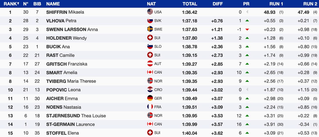 На „ Црвени спуст “ през днешния ден Шифрин прелетя през трасето в първия манш и си обезпечи задатък от 0.23 секунди по отношение на шведката Анна Свен Ларсон, която бе изпреварена от Петра Влъхова във второто втурване. Силите на словачката обаче не доближиха да се пребори с Шифрин, която даде четвъртото най-хубаво време във втория манш, прибавяйки нови 0.21 секунди към задатъка си пред Влъхова, който след първото минаване на трасето беше 0.55.
