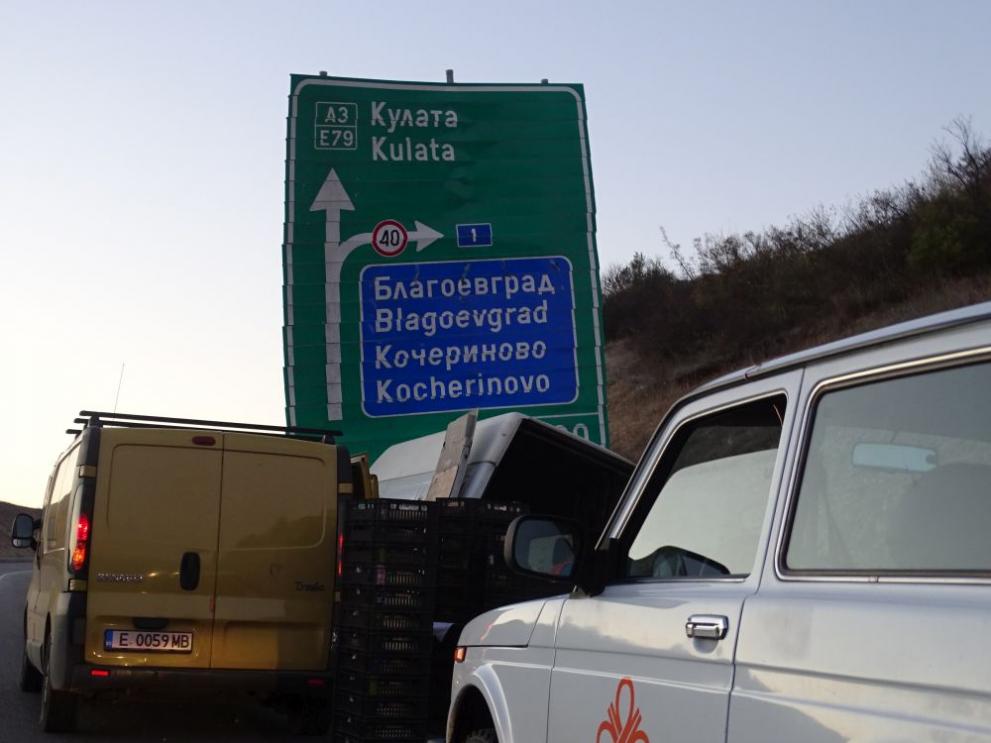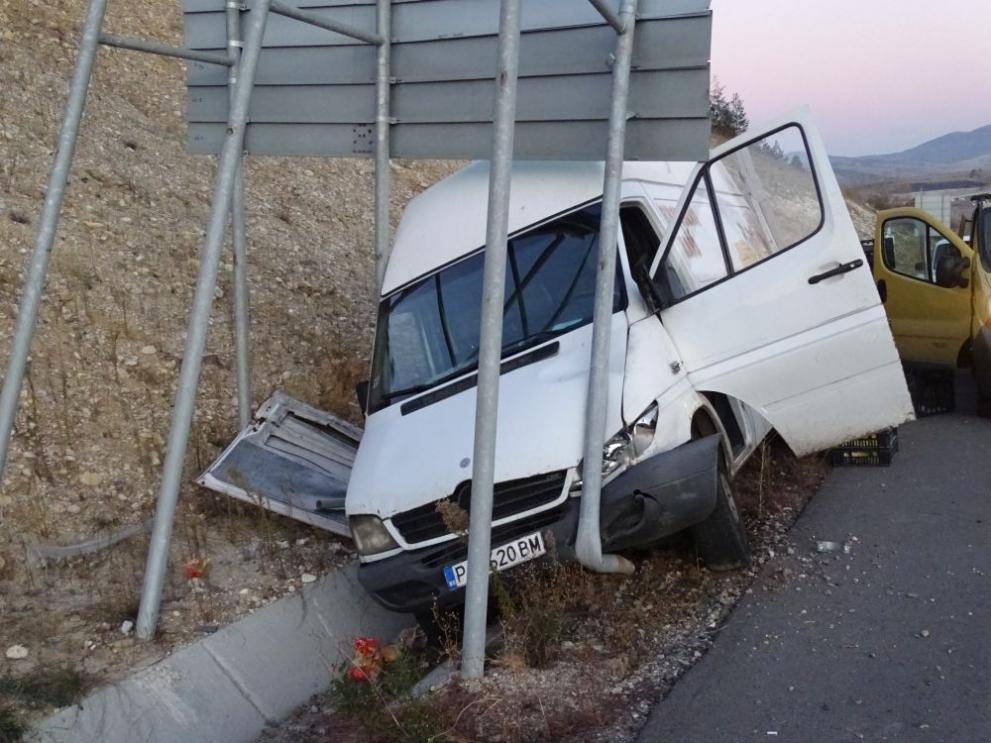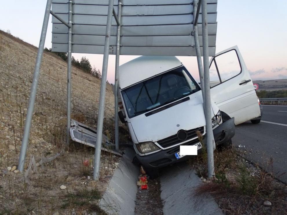 БГНЕС Сигналът за пътния случай е подаден към 6.00 ч. тази заран. Малко преди излизането от автомагистралата в посока Благоевград и Рилския манастир микробусът се отклонява надясно и пада в крайпътната канавка. След което се блъска с предната част в указателна табела. Микробусът транспортира самун в посока Благоевград.