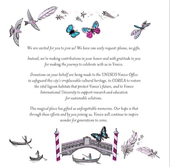 Безос и Санчес изрично помолиха поканените да не носят дарове. Вместо това двойката оповестява, че е направила дарения от името на всички посетители към три дела, директно свързани с Венеция: