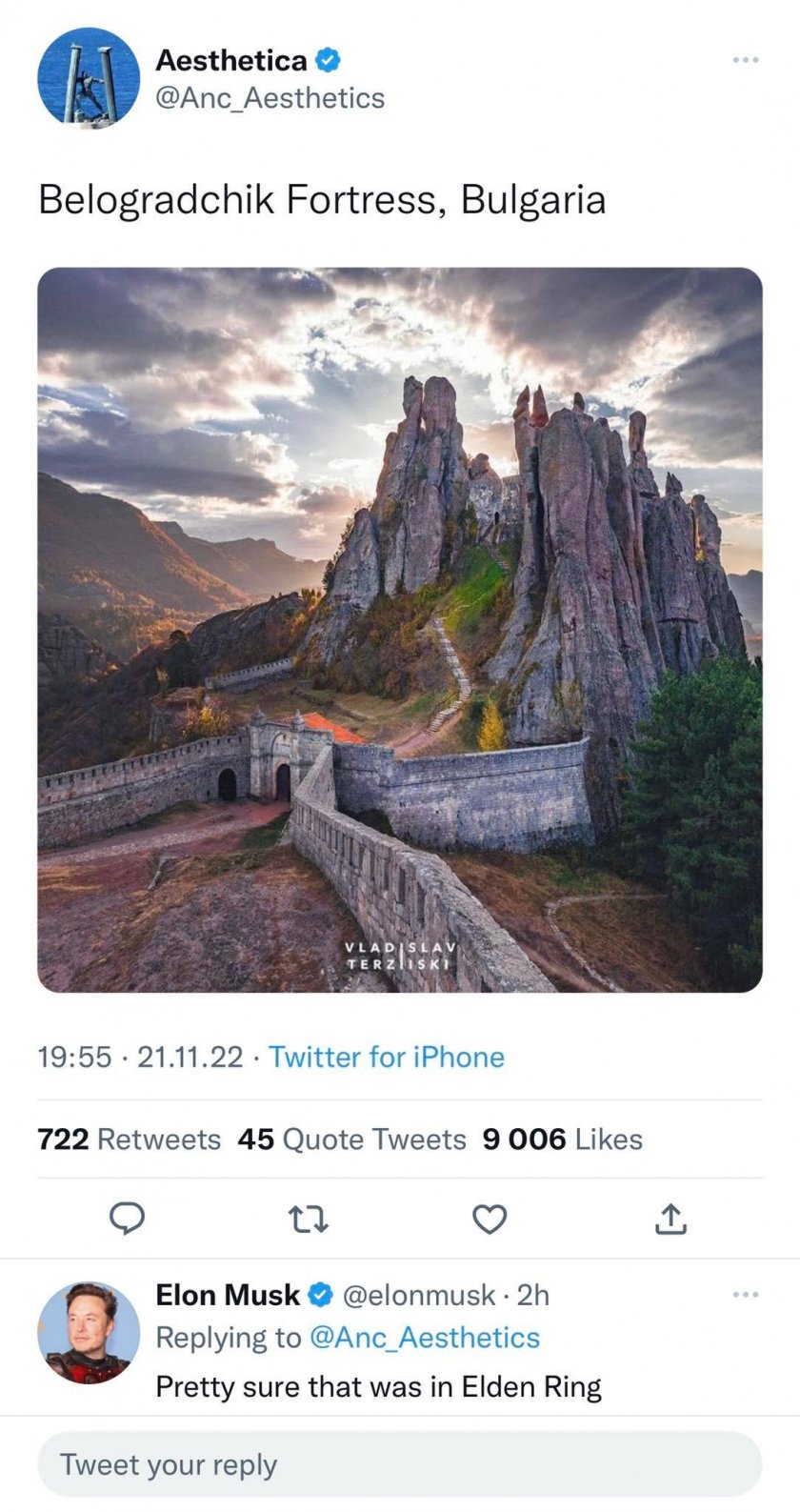 Министърът на туризма Илин Димитров през вчерашния ден предложения Илон Мъск да посети България, посредством " Туитър " и " Facebook ", откакто най-богатият човек в света показа и реагира на обява, изобразяваща естествения феномен. Снимката е на крепостта " Калето " в Белоградчик и е направена от българския фотограф Владислав Терзийски. Тя е снимана с дрон и разкрива уникалността на скалите и историческата цитадела.