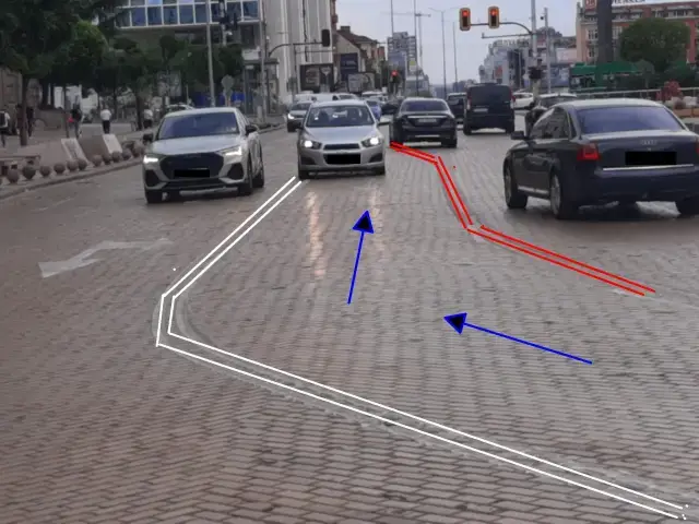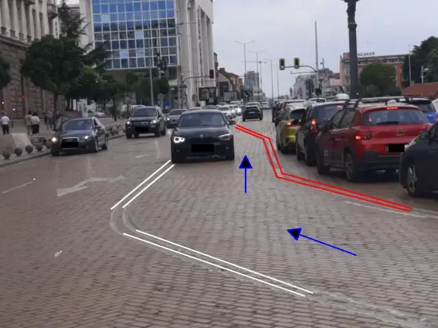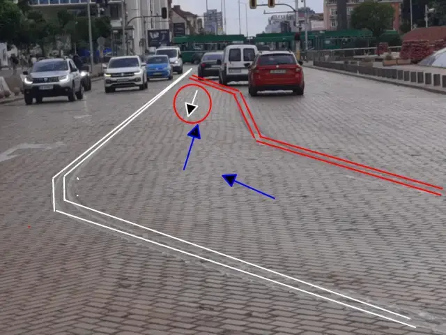 В синьо е показана новата посока на придвижване, белите линии са новата маркировка, която не се вижда към този момент, а алените линии са остарялата маркировка