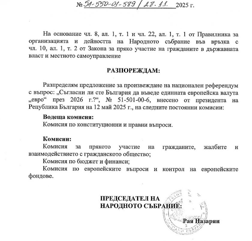 Миналата седмица тихомълком и без никакво публично разискване прясната председателка на Народното събрание Рая Назарян е задвижила скандалния референдум за еврото на президента Румен Радев, научи извънредно Lupa.bg от депутати.