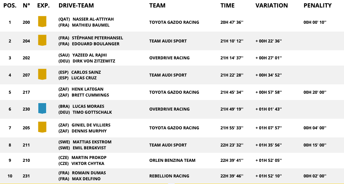 Катарецът, който има общо четири победи в „ Дакар “, приключи 375-километровото предизвикателство за 4:13:23 часа, побеждавайки с 1:57 минути испанеца Карлос Сайнц (Ауди). Трети остана другият водач на Ауди Стефан Петерханзел, който изостана с 3:44 от спечелилия Ал-Атия.