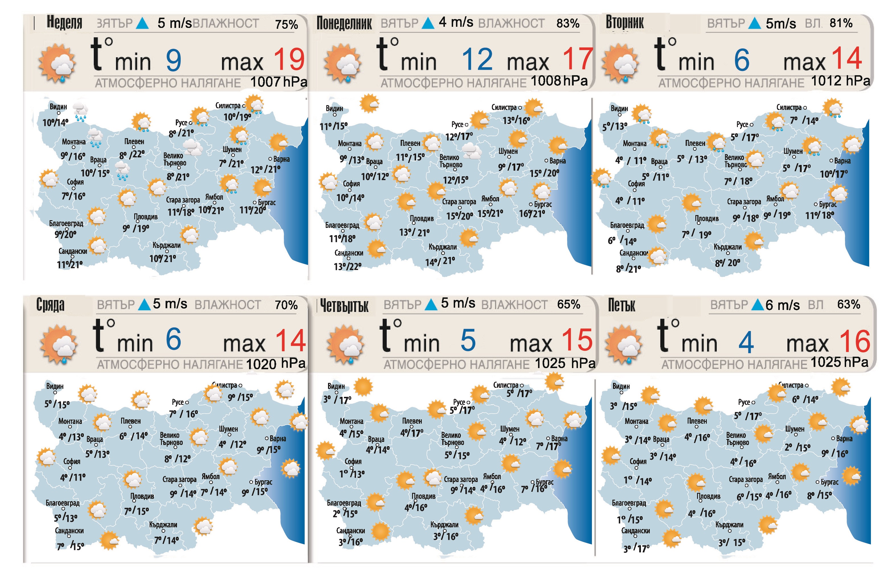 По високите елементи на планините ще духат засилени ветрове от запад (скорости до 50 км/час). Максимални температури, от 18 до 23 градуса. По Черноморието дневни температури до 17, 20 градуса, за региона на София до 18, 19 градуса.