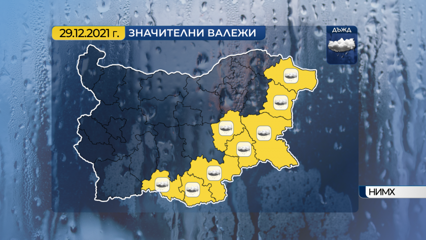 В източната половина от страната ще има и превалявания от дъжд, обилни по количество тук-там в Родопите и крайните южни и източни региони. Сутринта в Североизточна България ще има условия за поледици. В Западна България ще има най-вече ръмежи, преди обяд на доста места и мъгли.