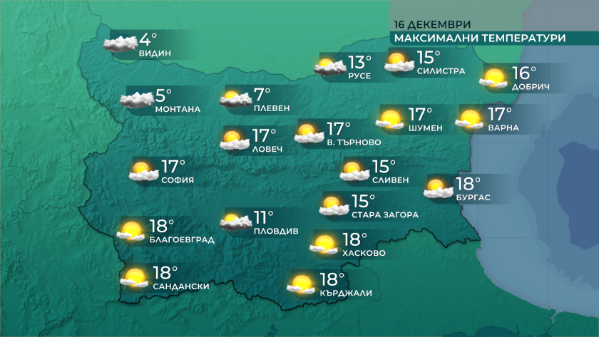 В събота ще е към момента топло за средата на декември с минимални температури в по-голямата част от страната сред 5° и 10° и оптимални - сред 13° и 18°. Преди обяд тук-там в северозападната половина от страната, а следобяд и през нощта против неделя в Южна и Източна България ще има превалявания от дъжд.