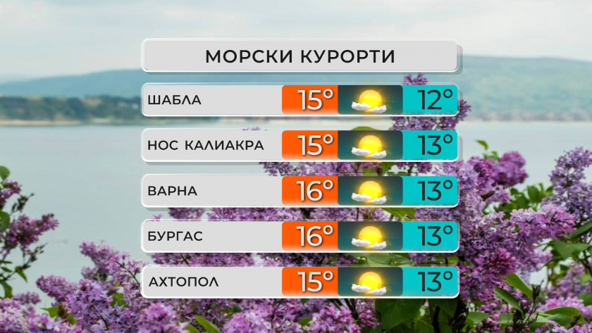 По Черноморието ще доминира слънчево време. Ще духа до сдържан източен вятър. Максималните температури ще са от 14° до 16°. Температурата на морската вода е 12°-13°. Вълнението на морето ще бъде 2-3 бала.