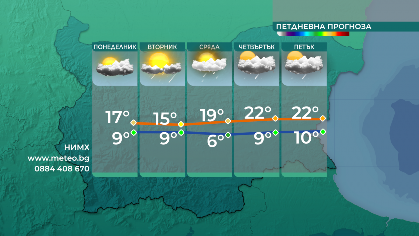 Облачността ще продължи да се усилва и ще обхване по-голямата част от страната, като се изключи крайните източни региони, където ще доминира слънчево време. Вечерта ще стартират валежи, първо в Югозападна България. Ще духа до сдържан, в Дунавската низина и Източна България краткотрайно мощен източен вятър.