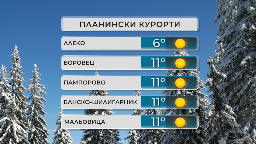В планините ще бъде слънчево. Ще духа най-вече сдържан вятър от запад-северозапад. Ще се затопли още и оптималната температура на 1200 метра ще е към 12°, на 2000 метра - към 5°.