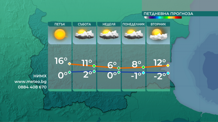 По Черноморието ще е слънчево. Ще духа сдържан югозападен вятър. Максималните температури ще са 10°-14°. Температурата на морската вода е 6°-7°. Вълнението на морето ще бъде 1-2 бала.