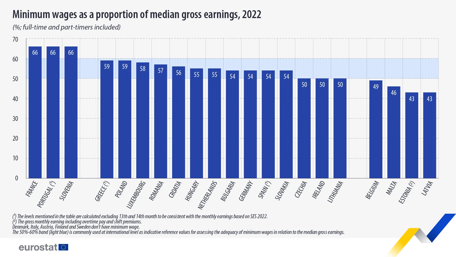 Представени като дял от междинните брутни месечни хонорари, през 2022 година минималните заплати са били над 60% от междинните заплати единствено в три страни: Франция, Португалия и Словения (66% и в трите).