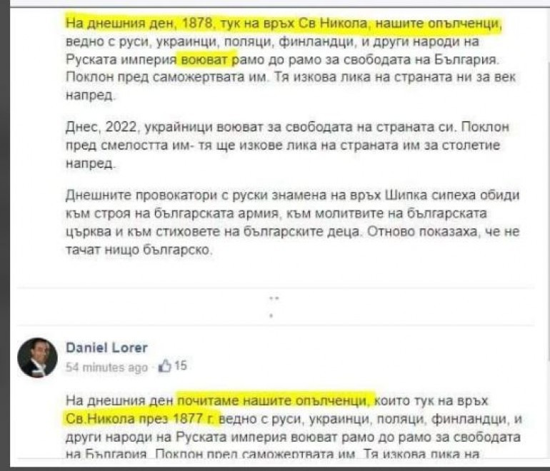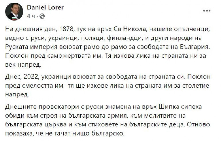 Министър Даниел Лорер реши да поздрави българите с националния празник. По всичко пролича обаче, че не се е срещнал в елементи с българската история. Така, съгласно него, на 3 март през 1878 година на връх Св. Никола нашите опълченци са извоювали свободата на България.