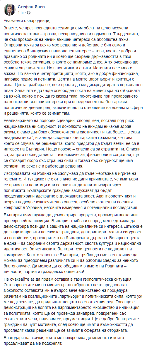 Министърът на защитата Стефан Янев разгласи във Фейсбук, че няма да подаде оставка. Той отбелязва, че отговорностите му на министър не го допускат в актуалната геополитическа обстановка. За оставката на Янев се заприказва, откакто той настойчиво отхвърля да назова война съветската експанзия в Украйна. В петък бе инициирана подписка за отстраняването му от деятели на " Демократична България ", само че в неделя от " Продължаваме промяната " отхвърлиха публично сътрудникът им да е поставял такова искане. Вижте и целия пост на Янев: Уважаеми сънародници,Знаете, че през последната седмица съм обект на целенасочена политическа офанзива – грозна, несправедлива и подмолна. Твърденията, че съм проводник на нечии външни ползи са безспорна неистина. Отправна точка за всяко мое решение и деяние е бил единствено и само българският народен интерес – това, което е положително и вярно за родината ни и което ще запази държавността в тази изключително тежка обстановка, в която се намираме през днешния ден. А тя явно ще става и още по-тежка. Но в политиката е по този начин. Истината не е доста значима. По-важна е интерпретацията, която, в случай че е добре финансирана, напряко подменя истината. Целта на моите „ сътрудници “ и критици е ясна. Целта, несъмнено, не е просто да ме дискредитират в личен проект. Задачата е да бъде освободен поста на министъра на защитата за някой, който е по-, да го кажем по този начин, по-отзивчив при прокарването на съответни външни ползи при определянето на българския политически дневен ред, в това число във връзка с военната сфера и решенията, които се взимат там.Реализирането на сходен сюжет, съгласно мен, слага под риск националната ни сигурност. И доколкото не виждам никакъв здрав разсъдък, а единствено надълбоко притеснителна безредица и по какъв начин беше... „ тежка некомпетентност “, желая да споделя с българските жители, че това, което се случва, че решенията, които следва да бъдат взети, не са в полза на България. Нещо повече – рискови са за страната ни. Опасни са, тъй като следствията – стопански, финансови и обществени, ще се стоварят скоро със страшна мощ и тогава сигурно ще има оставки, само че към този момент не и работещи решения.Изстрадалата ни Родина не заслужава да бъде жертвана в игрите на огромните. И тук дори не е от голяма важност дали повода е, че дилетанти се вършат на политици или се пробват да капитализират посредством политиката. Българските жители заслужават да бъдат представлявани съответно в държавната власт. Авантюристичният и неузрял метод е извънредно рисков, изключително предвид на военния спор в Украйна, неговите измерения и евентуални последици.България няма потребност да показва проруска, проамериканска или проевропейска позиция. България би трябвало и съгласно мен е длъжна да показва позиция в отбрана на националните си ползи. Длъжна е да отбрани правата на своите жители, да подсигурява тяхната сигурност и успокоение, просперитета на българската страна. Всъщност задачата е една – да съхраним своята държавност, своята просвета и национална еднаквост. За същинските българи тези полезности не подлежат на компромис. Когато залогът е България, би трябвало да сме в положение да можем да преодолеем разликите си и да работим дружно за нейното благоденствие. Да можем да се обединим в името на