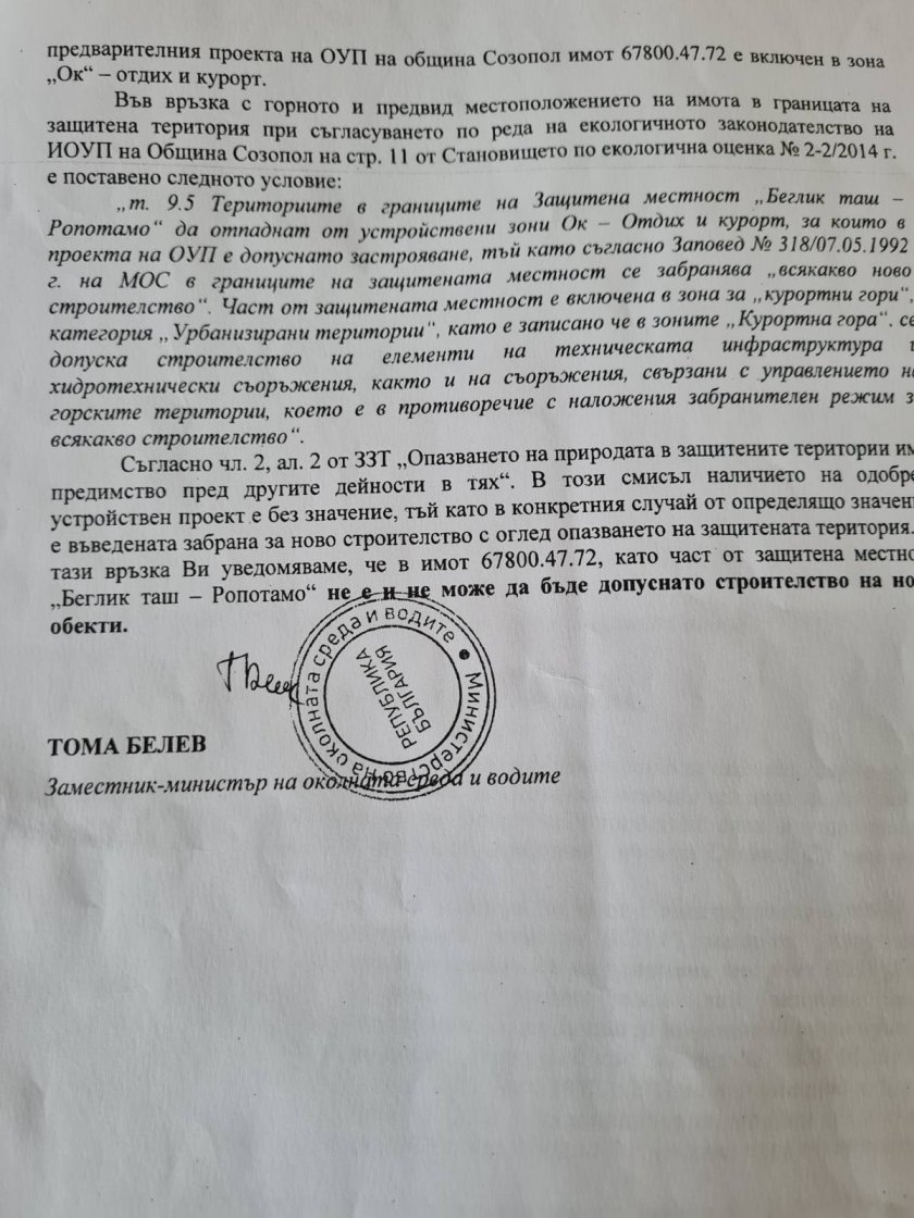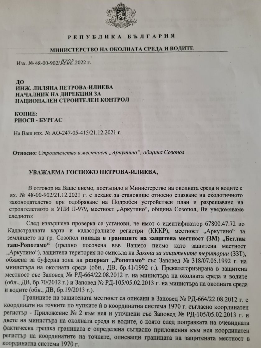 С писмото с номер 48-00-902 от 07.02.2022г. до Регионална инспекция за опазване на околната среда Бургас, зам. министърът Белев не възразява да се извърши " реорганизация и дотъкмяване на замразен обект жилищна група „ Знаме на мира ". В писмото само се прави съобщение, че е неразрешено строителството на нови обекти. Но в него няма експлицитен текст, който да не допусне застрояването на тази неповторима естествена даденост.
