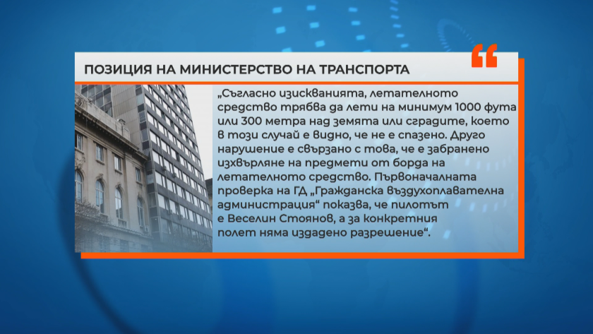 Днес не успяхме да се свържем с водача, нает за каскадата. След назначената инспекция той и авиационният оператор могат да останат без лицензи. Утре следва среща на транспортния министър и с управлението на дирекцията за въздушно-гражданска авиация за изясняване на случая.