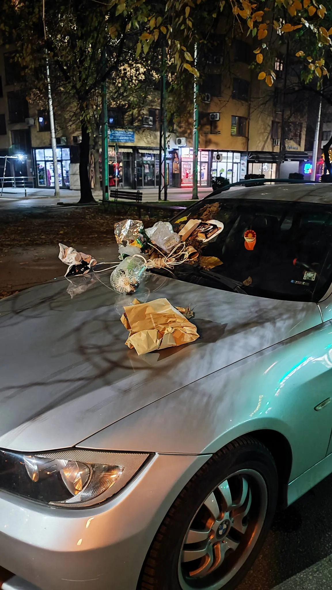 Здравейте. Тази вечер заварих тези два автомобила по този метод. Мястото е бул. „ Македония “ 46, в локалното, пред аптека Soler. Преди 2 седмици и моят автомобил беше с торба отпадък от горната страна. Предполагам, в аптеката има камери и записите могат да бъдат изискани. Ако някой знае кой субект прави тези мизерии, може да показа с мен. Предполагаме, че живее в региона.
