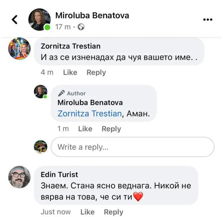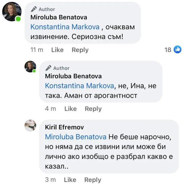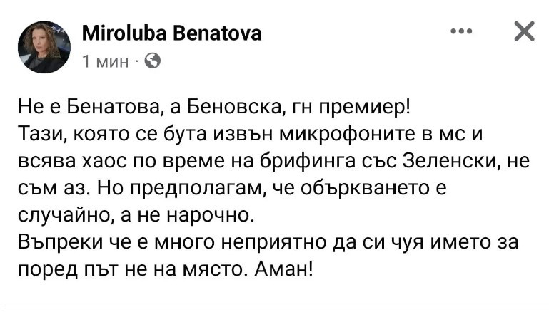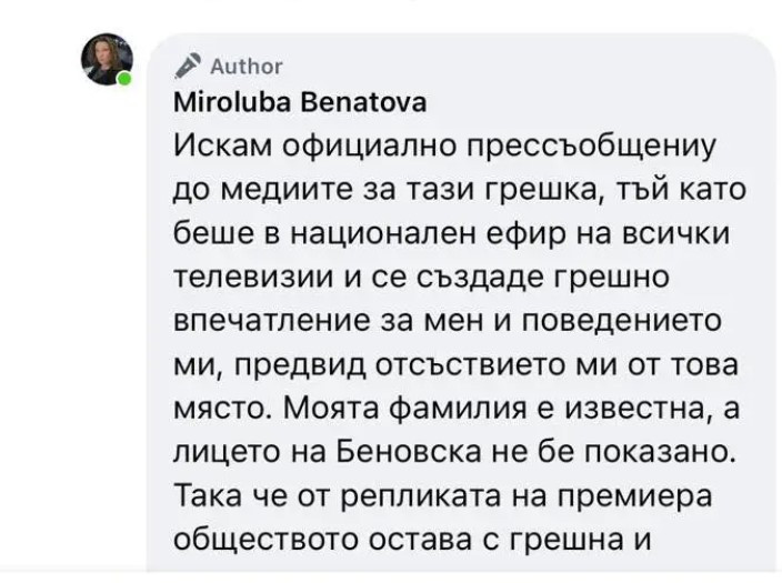 Бенатова посочи, че написаното от нея не е смешка и желае публично прессъобщение от Министерски съвет с опрощение за обърканото й име.