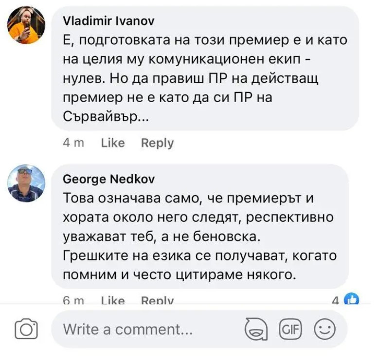 По време на изказването журналистката Илияна Беновска изиска да зададе въпросите си, само че отвън микрофона. В опита да овладее ситуацията, Денков обърка семейството й, като я назова Бенатова.