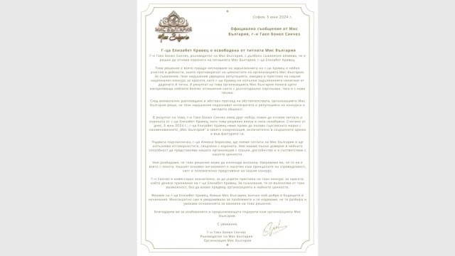 " Г-н Гаел Бонел Санчез, началник на Мис България, с надълбоко страдание афишира, че е решил да отнеме короната на сегашната Мис България госпожица Елизабет Кравец. Това решение е взето заради неспазване на отговорностите на госпожица Кравец и нейно присъединяване в действия, които опонират на полезностите на организацията на Мис България. За, страдание, тези нарушавания повредиха репутацията, имиджа и престижа на нашия народен конкурс за хубост, като госпожица Кравец не извърши отговорностите налагани от дадената ѝ купа.