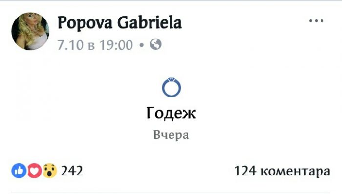 Мис силикон от Перник Габриела Попова се сгоди. Новината показа самата тя на профила си през вчерашния ден във Facebook, написа ZaPernik.com. Под поста незабавно заваляха стотици поздравления за Габи и пожелания за доста благополучие и обич. Очевидно на силиконката й е препоръчан брак през вчерашния ден, 7-ми октомври, само че нейният обичан остава в тайнственост за медиите.