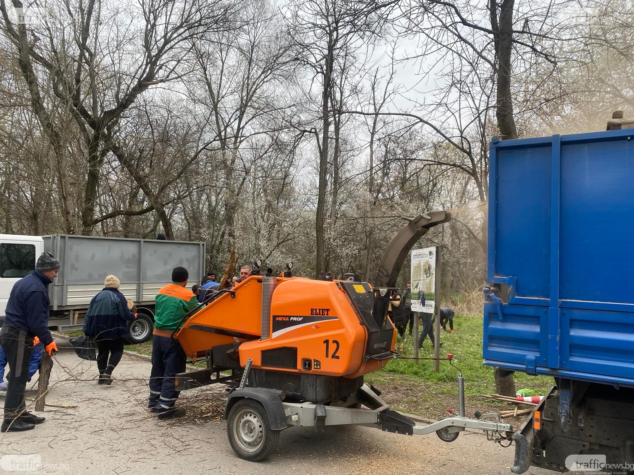 Служители на " Паркове и градини " от няколко седмици приготвят дървесината за изнасяне, като режат нападалите дървета и рискови клони.