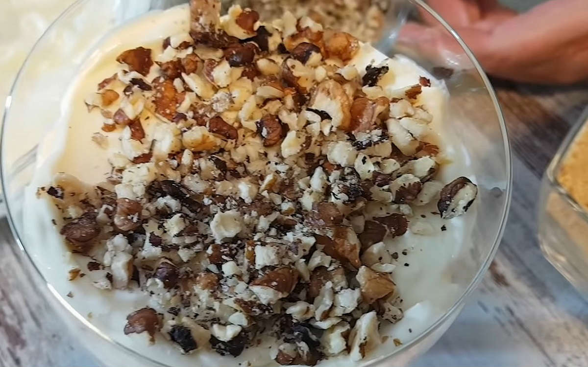 Вземете чашки за десерта. Първият и вторият слой са бисквитки с два цвята. На последващо място – маслен крем, ядки. Повторете пластовете още веднъж.