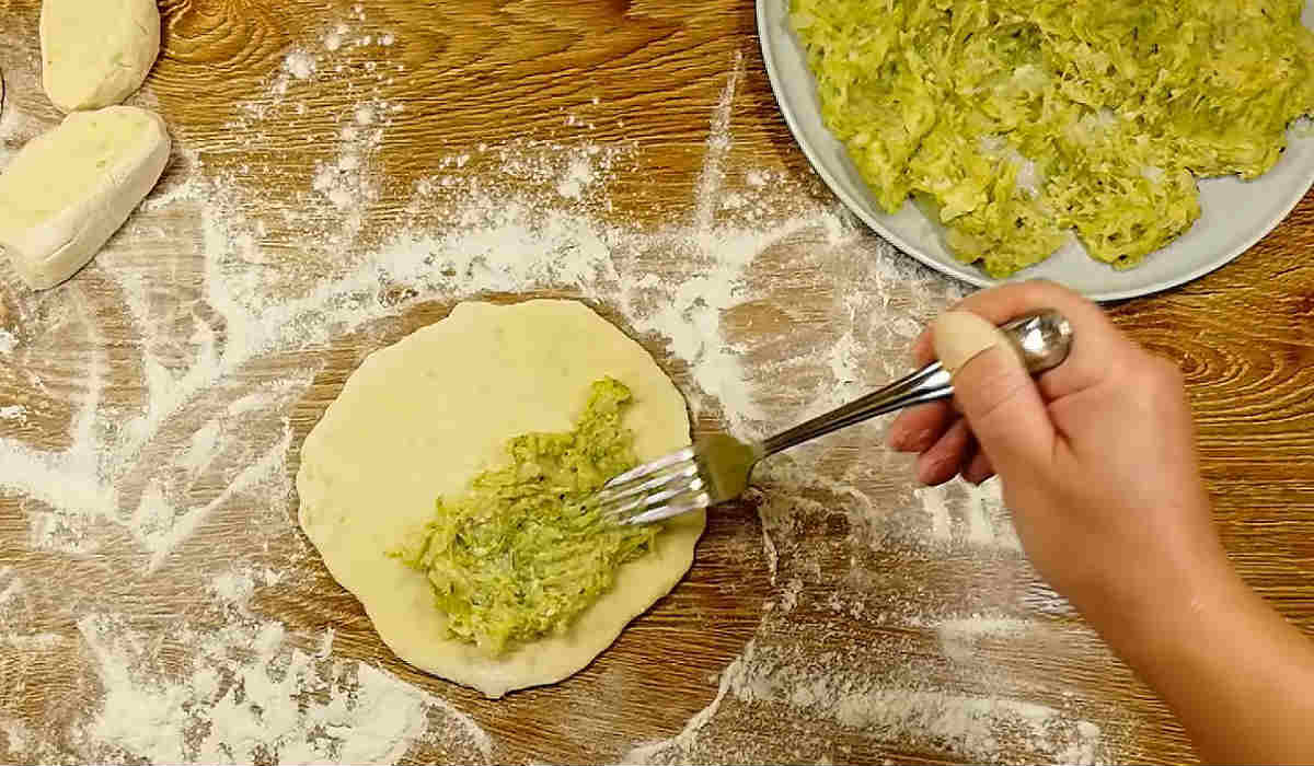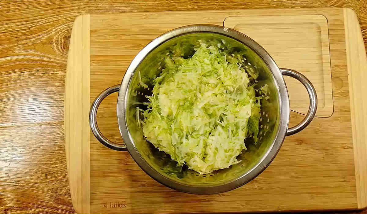 Настържете тиквичките на едро ренде, изцедете непотребната течност. Подправете със сол, разбъркайте и оставете за 10 минути.