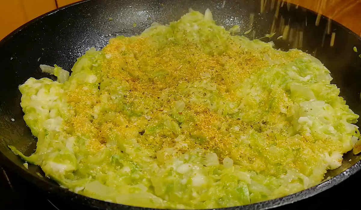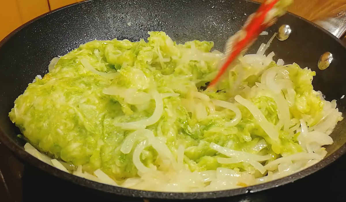 Изцедете тиквичките от течността и ги изпратете в тигана с лука. Гответе към 5 минути.