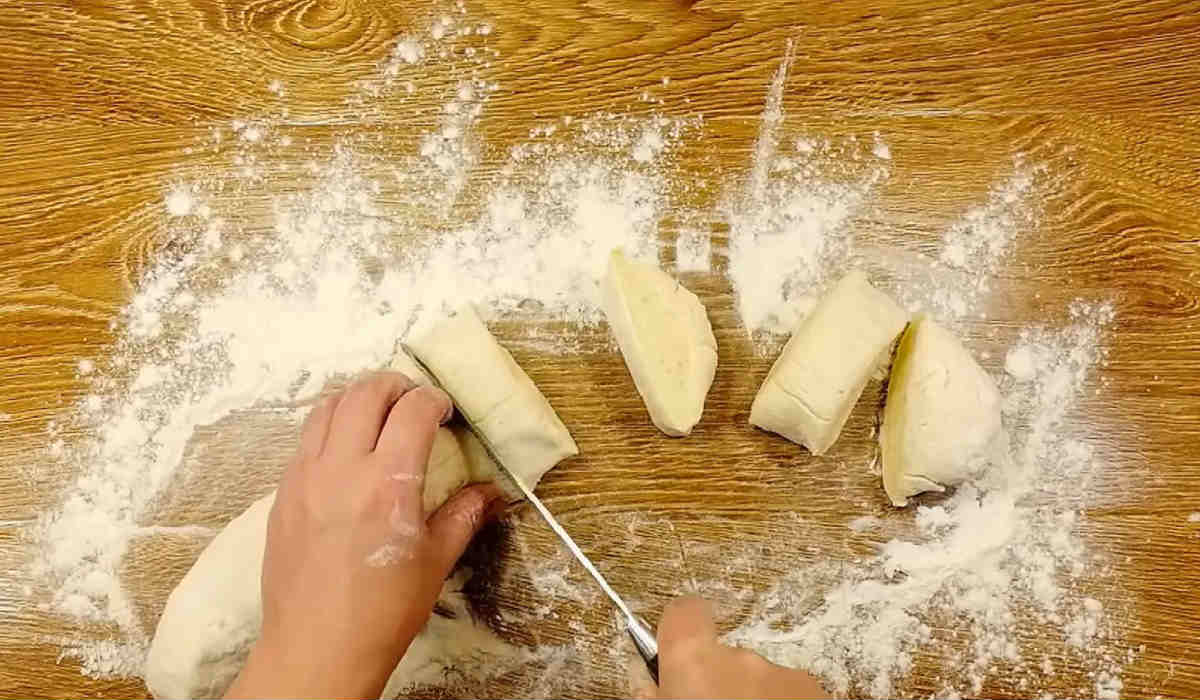 Набрашнете работната повърхнина. Оформете тестото и го нарежете на части.