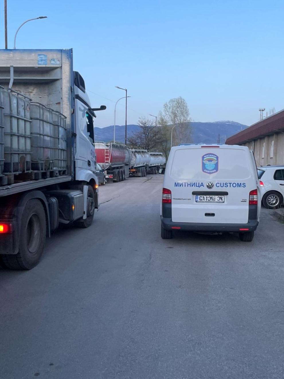 Агенция „ Митници “ На паркинг в региона на Благоевград със съдействието на органите на Министерство на вътрешните работи, митническите инспектори ревизират друго товарно транспортно средство, което също транспортира алкохол 96%vol с общо количество 18 600 литра в 20 идентични куб-контейнера . В хода на инспекциите и на двата товара не са предоставени документи, удостоверяващи заплащане, начисляване или застраховане на дължимия данък.
